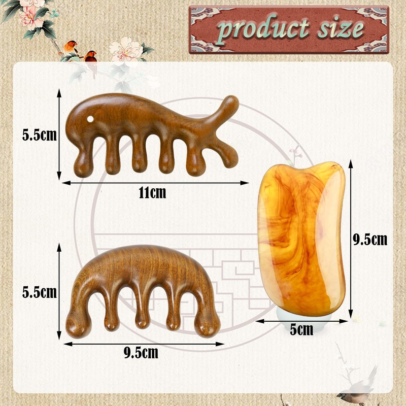Size: five-tooth comb 9.5 x 5.5 x 2 cm, comb 11 x 5.5 x 1.8 cm, guasha stone 9.5 x 5 cm.