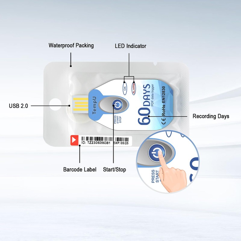 TempU02 is a single use temperature data logger with PDF report. IP67 waterproof, supports working in a high humidity environment. USB port, automatically generate PDF report, no software required. Comes with a round stickers can be fixed in specific places.