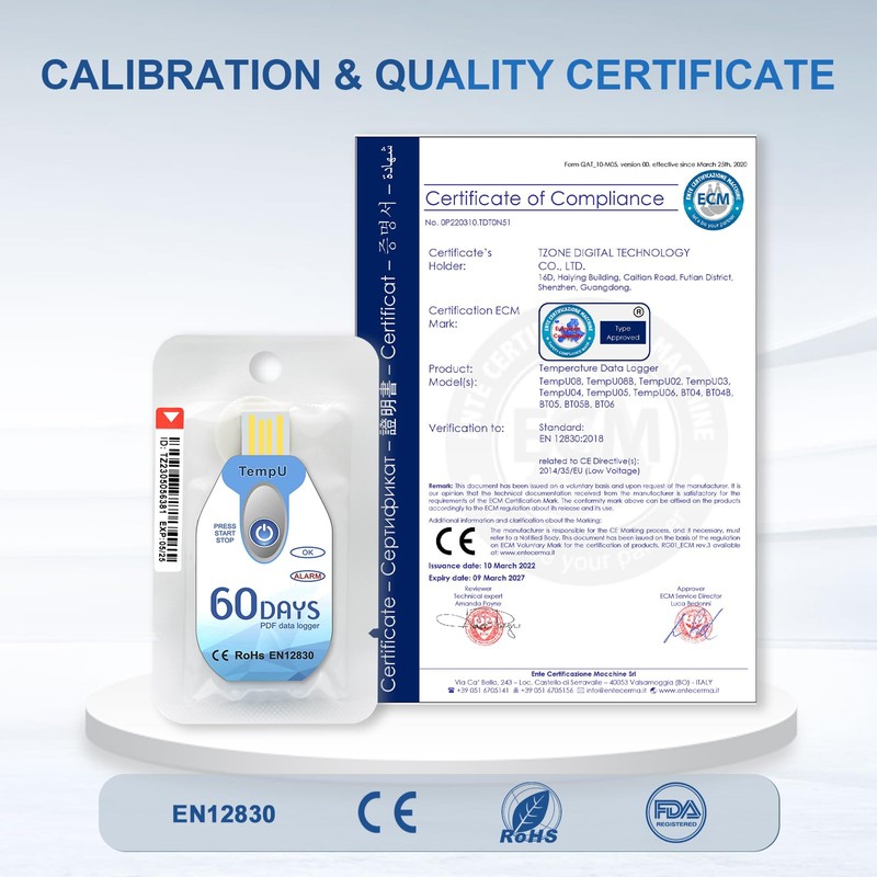 • Quality Certification: 10 packs disposable temp loggers come with calibration certificate; Compliant with EN12830, CE, RoHs, FDA standards; Widely used in cold chain transportation, food storage, medical refrigerator, etc., recording time up to 60 days