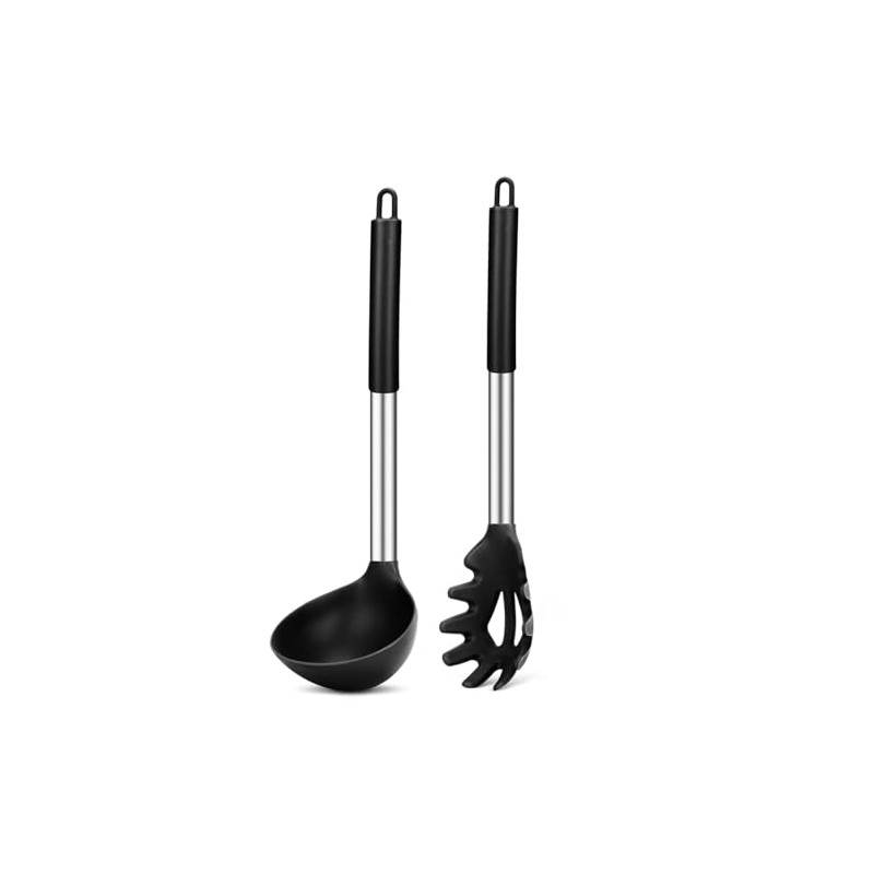 - MATERIAL DE CALIDAD: El tenedor de pasta y el cucharón de sopa están fabricados con acero inoxidable 18/8 de alta calidad, evitan la oxidación y rotura. Su mango de silicona antiquemaduras no conduce el calor, ofreciendo un agarre cómodo y seguro durante la cocción.