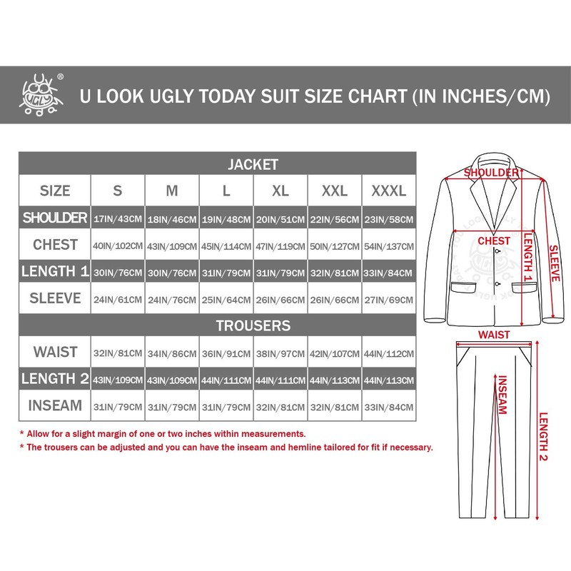 - Please use the size chart in the picture on the left to choose the right one. The right colour and embossed pattern can be found from the pictures. Slight colour and dimensional deviations are possible. Please note that our suit is cut in a regular fit.