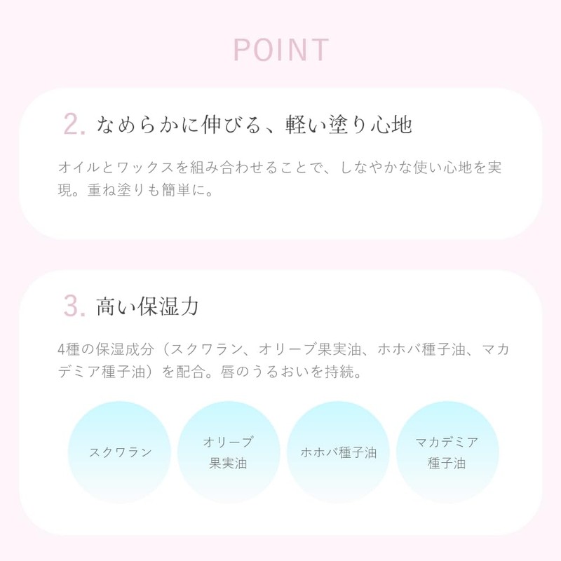 • Precautions for Use: Please be careful to ensure that there are no abnormalities in your lips. Discontinue use if cosmetics do not fit your skin or if such as the following: If you continue to use your cosmetics as it is, the symptoms may deteriorate, so we recommend you consult a dermatologist. (1) If any abnormalities such as redness, swelling, itching, or irritation occurred during use. (2) If you experience any of the above abnormalities due to direct sunlight. Please do not use on areas with abnormalities, such as scratches, swelling, and plaster. Keep out of reach of infants. Store in places with extreme low temperatures or high humidity or direct sunlight. Close the cap firmly after use. Please note that it may not fall off with clothing