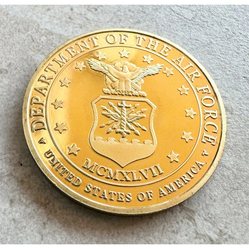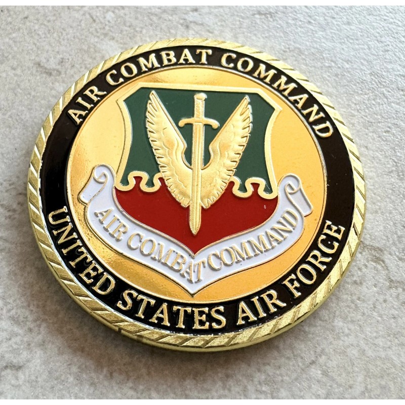 This is a US AIR FORCE Air Combat Command Commemorative Challenge Coin. Insignia on front side and rear side displays a gold plated U S Air Force logo. Coin is about 1 9/16" in diameter. All details are raised lettering. Coin is contained in an acrylic air tight holder.