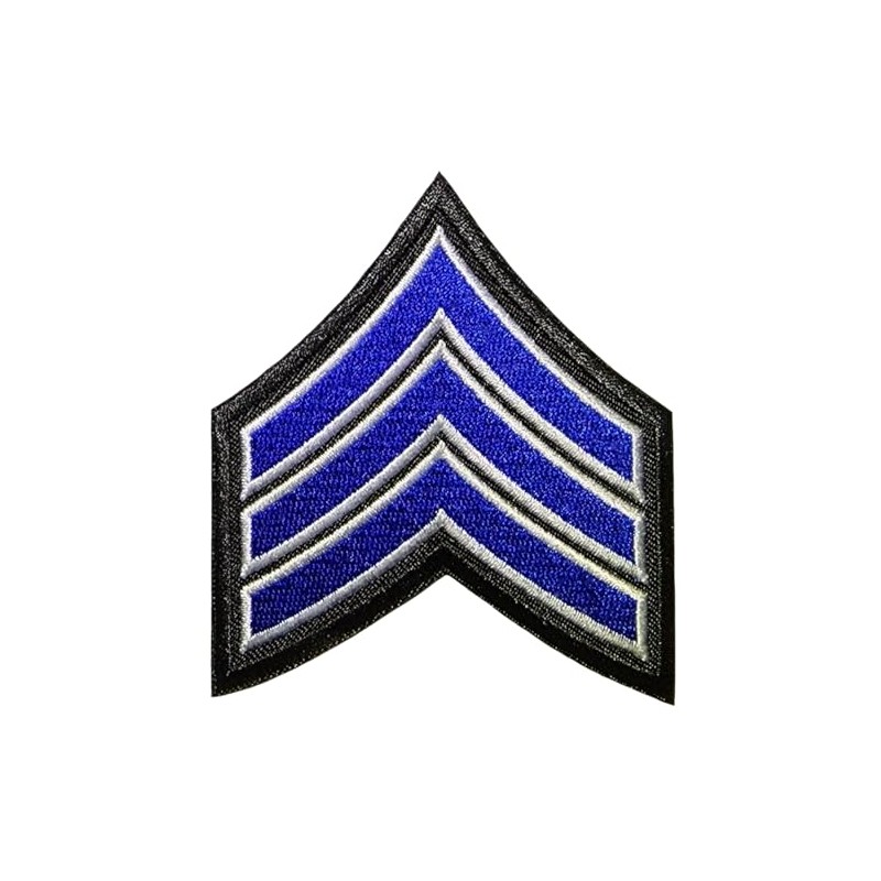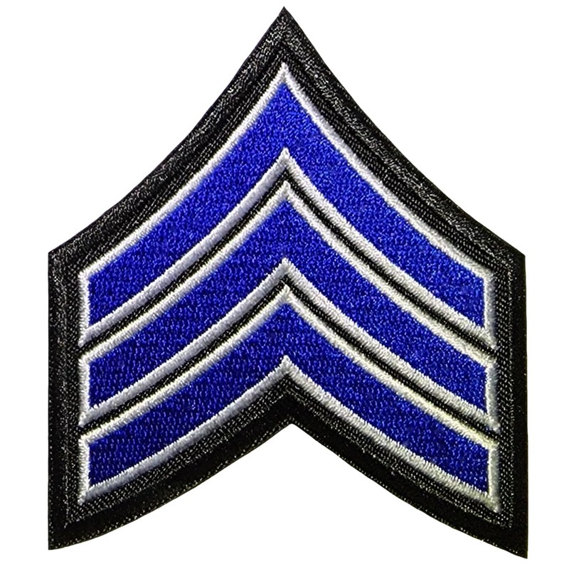 U.S. Army Sergeant E-5 Stripe Army Uniform Chevron Rank Sew on Iron on Arm Shoulder Embroidered Applique Patch - Blue on Black - by Ranger Return (RR-IRON-E5-BKBL)