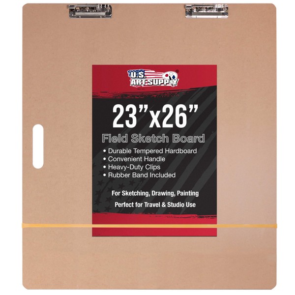 U.S. Art Supply 23" x 26" Artist Sketch Tote Board - Lightweight Hardboard Drawing Board with Handle, Clip & Rubber Band for Art, Sketching, Travel, Studio