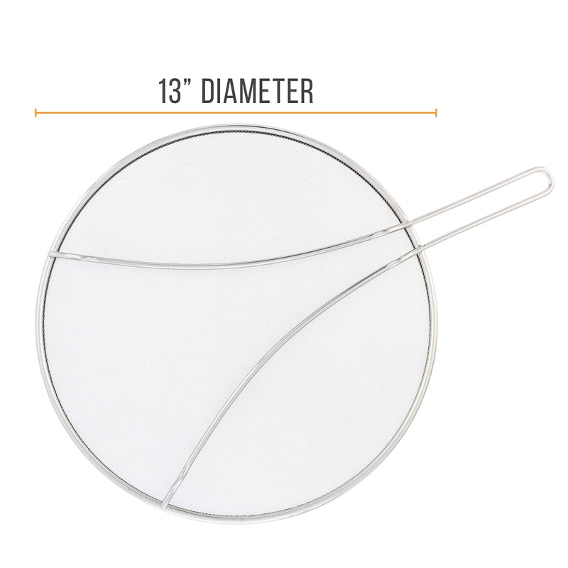 • Professional Grade 13" Splatter Screen: A durable and sturdy high performance 13" stainless steel splatter screen with 3 counter top resting feet. It's made with professional grade stainless steel and contains a rust-proof fine wire mesh screen with a durable double thick twill weave. This fine twill weave allows the screen to resist denting, catch finer particles and keep it flat and stable for repeated daily use. It's suitable for almost any size of pot or pan.