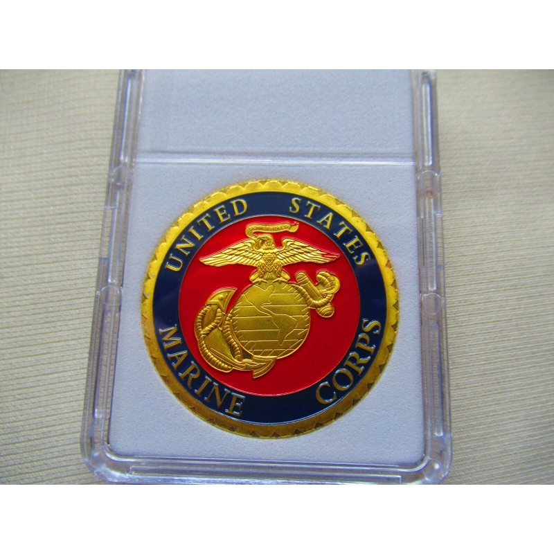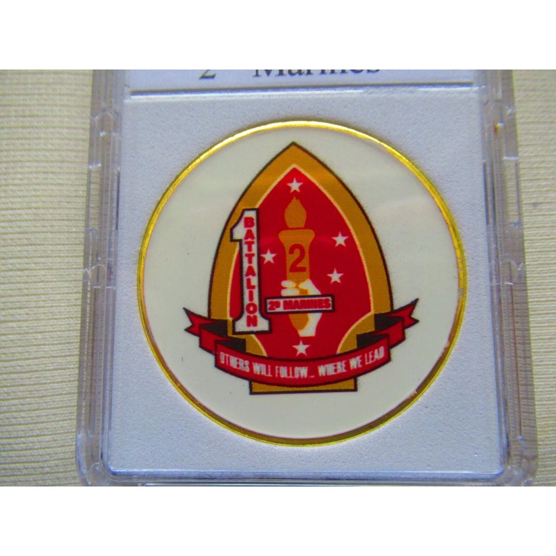 This is a great looking U S Marines, 1st Battalion, 2nd Marines commemorative challenge coin. Coin has reeded edges and is about 1 9/16" in diameter. Front side of coin is printed and colorized while the rear side is raised lettering and gold plated. Coin is contained in an acrylic air tight holder.