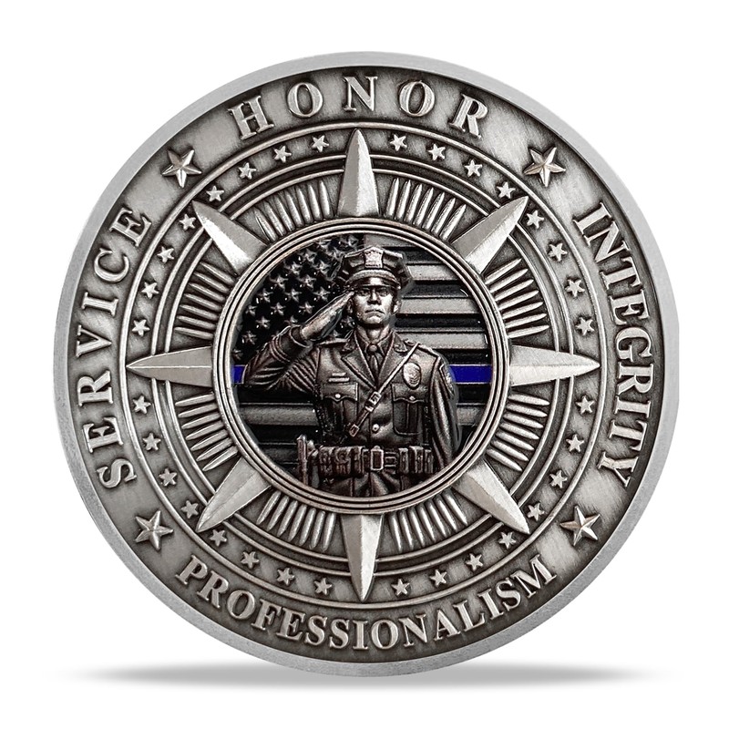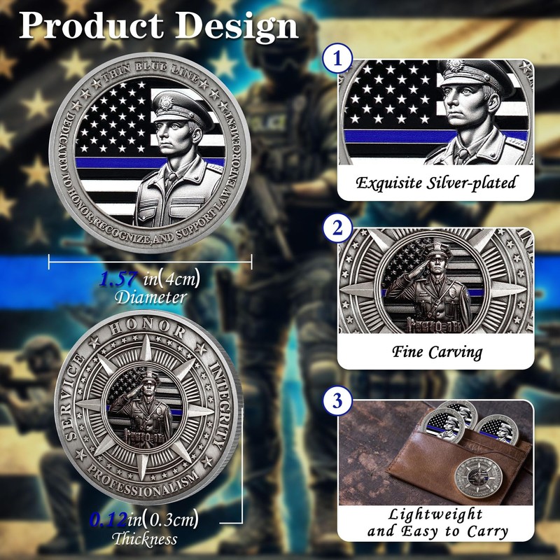 - 𝗘𝘅𝗰𝗲𝗽𝘁𝗶𝗼𝗻𝗮𝗹 𝗗𝗲𝘀𝗶𝗴𝗻: The front of this police coin features an officer in uniform against the Thin Blue Line flag, while the back displays the core values of "Service, Honor, Integrity, Professionalism."with a saluting police officer. The intricate details make this law enforcement challenge coin a standout among other police gifts.