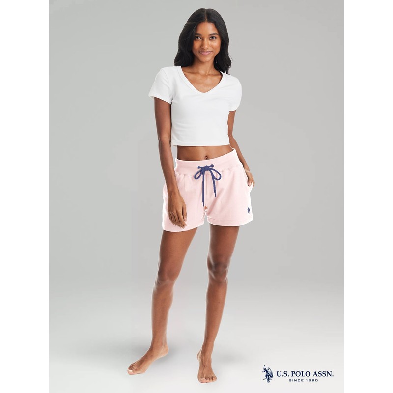 Elasticized, ribbed waistband boasts a shoestring drawcord to adjust the fit on the waist and hips. The U.S. Polo Assn. logo accents the front hem.