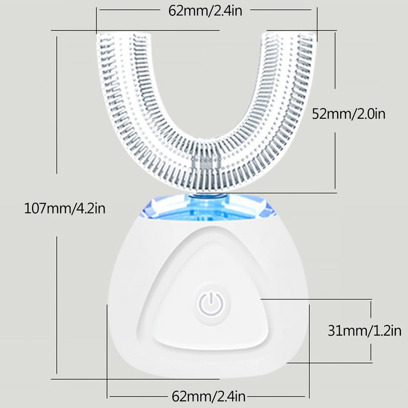 1、With 6000rpm high-frequency ultrasonic vibration,it can contact the teeth and gums 360 degrees in all directions to quickly and deeply clean the surface and interior of the teeth. 2、Removable food-grade silicone U-shaped brush head completely surround your teeth.fits most adult\u0027s mouth. 3、One button control to start brushing,smart 30s timing to complete 360 degree oral cleaning.