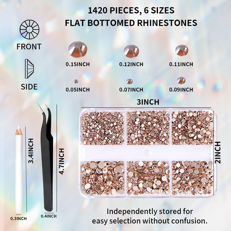 6 sizes, a total of 1420 rhinestones, stored in different small compartments, sufficient for daily use.