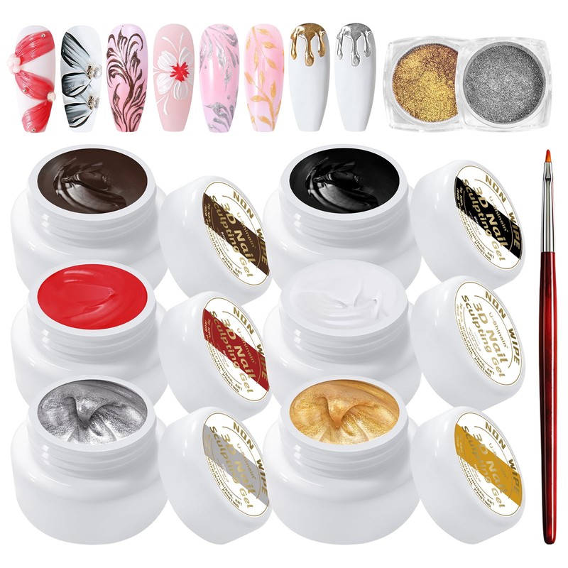 - 5-In-1 3D Nail Sculpting Gel Set:This 6pcs nail gel set with chrome nail powder breaks the boundary of traditional product functions, combining sculpture, nail painting,rub powder,mix glitter and DIY art in one. Meeting the needs of nail technicians diversified creativity, for the fingertip art to open up unlimited possibilities.