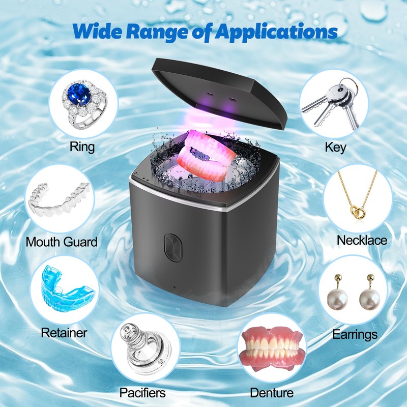 - 360°All-around Cleaning--The ultrasonic cleaner is equipped with 43000Hz sound waves and powerful U-V light,this ultrasonic retainer cleaner can remove the dirt from gap and crevices. The ultrasonic cleaning machine effectively clean the stains from Dentures,aligner, retainers, mouth guards, orthodontics, braces, whitening trays, night guards, and even jewelry can be bright and clean as new