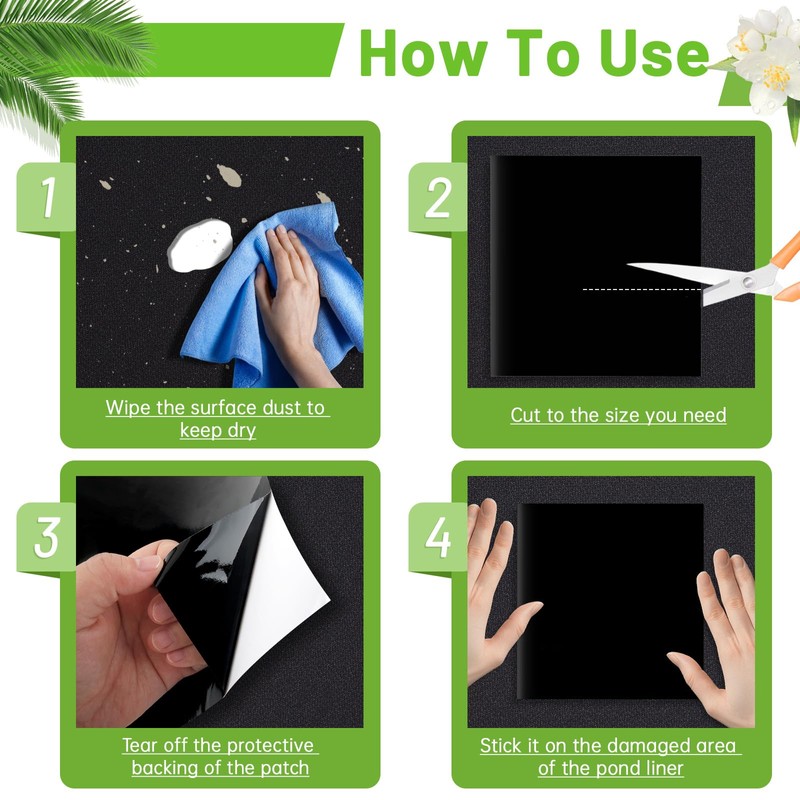 - Easy to Use: Clean and wipe the surface of the pond liner that needs to be repaired thoroughly, cut it to the required size, and then tear off the back and stick it firmly. And you can heat the patch with a hair dryer to make it stick more firmly