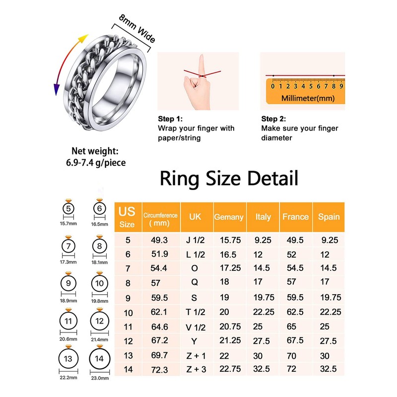 • 📐【 Size 】 Width 8mm, Thickness 2.8mm, Total Weight 7.5g. Size L 1/2 to Z+3 (US size 6 to 14).