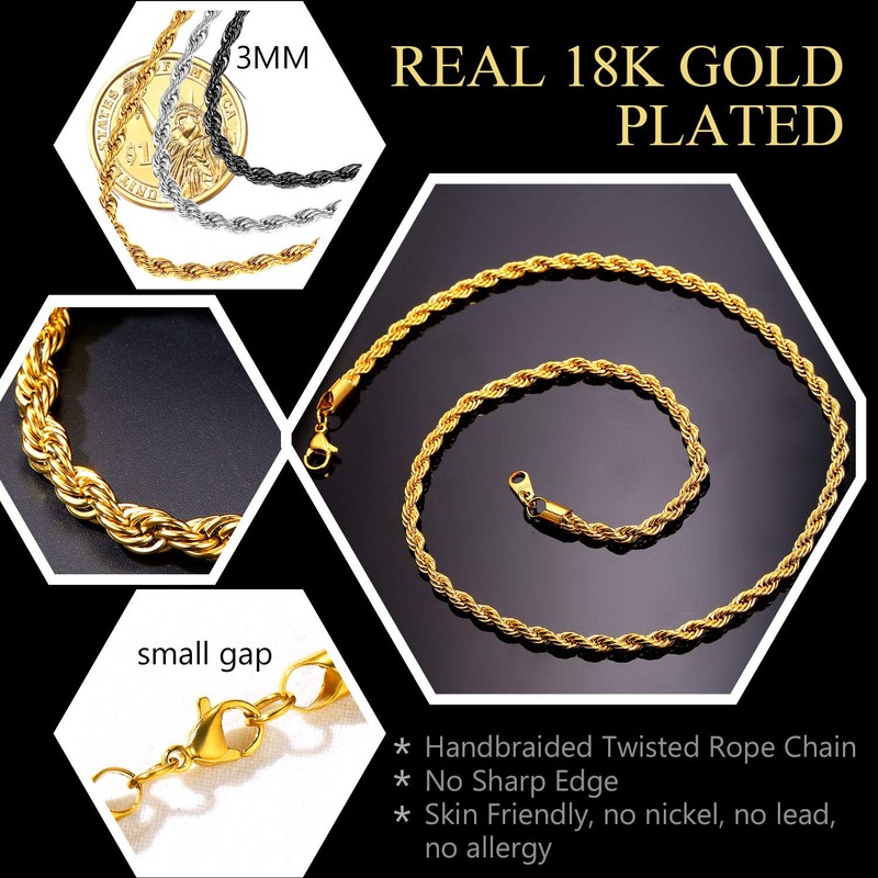 - Rope Jewelry Material : stainless steel metal based in 316L grade,Thick 18K Real Gold Plated over whole chain makes a personalized charming chain look ; lead free, nickel free, hypoallergenic, color lasting, no need to worry about skin hurting.