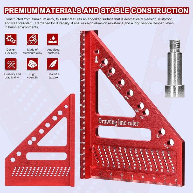 - 【PRECISE ANGLE CONTROL & WIDE APPLICABILITY】 The square protractor allows quick scribing at preset With an adjustable marker that can be inserted into the appropriate angle holes, precise angles such as 22.5°, 30°, 45°, 50°, 60°, 67.5°, 75° and 80° can be quickly marked. This greatly expands the practicality and adaptability of the tool.