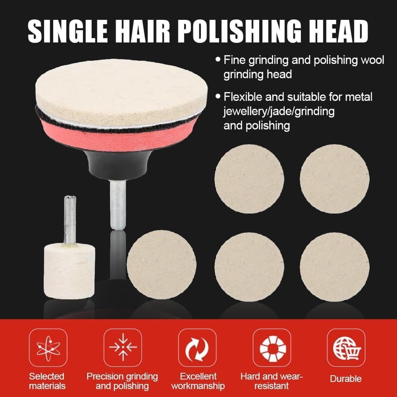 - Details about the glass polishing set: wool wheel diameter: 25 mm / 0.98 inches; pad diameter: 78 mm; size of the disc rod head: 6 mm; disc diameter: 80 mm.