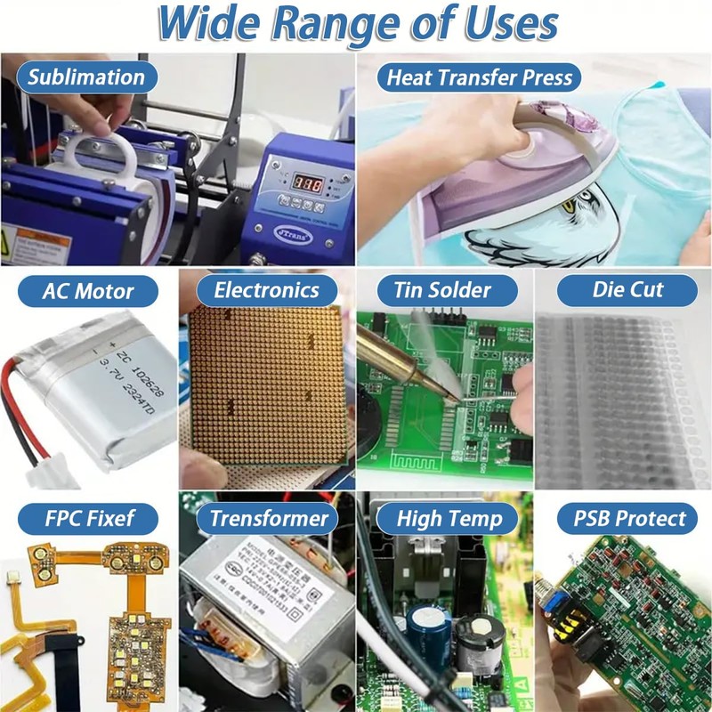 • 【High Temperature Resistant】: the heat resistance of the heat transfer tape is up to 448 F, which is good for protecting electronic products, electric motors, solder as well as painting, fixing packaging and printing plates