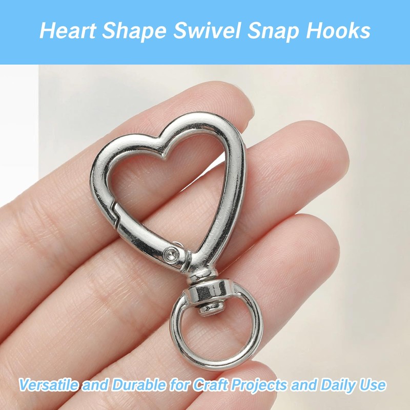 Elevate your crafting projects with our set of 10 heart-shaped swivel snap hooks, each measuring approximately 1.6 inches (4 mm) in length with a 1-inch (26 mm) inside width. These hooks are the ideal size for a variety of DIY crafts, from keychains to handbags and more. The heart carabiner shape adds a charming touch to any project, making your creations stand out.Crafted from durable zinc alloy, these cute heart carabiners are designed to withstand daily use. The strong metal construction ensures that they won't easily break or deform, providing long-lasting reliability for your projects. The swivel design allows for 360-degree rotation, making these heart keychain clips easy to attach and use in any direction. Whether you're securing a leash to a collar or adding a stylish touch to a handbag, these hooks offer smooth and versatile operation.These heart-shaped key rings are more than just cute—they're incredibly versatile. Use them for making keychains, dog collars, cat hammocks, belts, lanyards, and other creative projects. The multi-purpose design makes these carabiner hooks an essential tool for any DIY enthusiast. Each hook is designed with a clip-on swivel and D-rings for easy attachment, ensuring that your creations are both functional and fashionable.Looking for a thoughtful present idea? These heart-shaped carabiners are ideal for creating personalized, hand-crafted present . Whether you're making lanyards, necklaces, or keychains, these hooks add a special touch that your loved ones will appreciate. Imagine the joy on their faces when they receive a custom present made just for them. These hooks are ideal for creating unique and memorable present for birthdays, holidays, or just because.Whether you're an experienced crafter or just getting started, these heart-shaped carabiners are a fantastic addition to your crafting supplies.