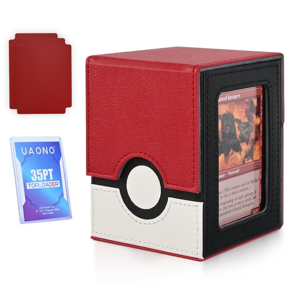 UAONO Card Deck Box with MTG Commander Display, Deck Case Holds 100+ Double-Sleeved Cards, Trading Card Storage Box Fits TCG/PTCG/Sports Card with 2 Dividers, 1 Toploader (Red, White)
