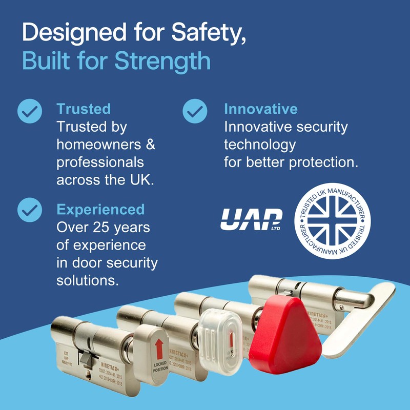- MULTI-PATENTED SAFETY FEATURES - Equipped with multi-patented safety features, they offer advanced defence capabilities through an ingenious cam system that ensures next-level protection. The cylinders meet the highest security standards, including EN1303:2015 certification, and are secured by design and approved for added peace of mind.
