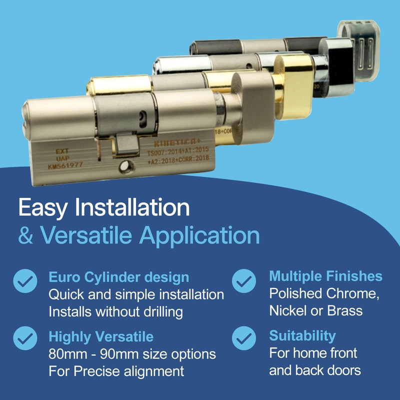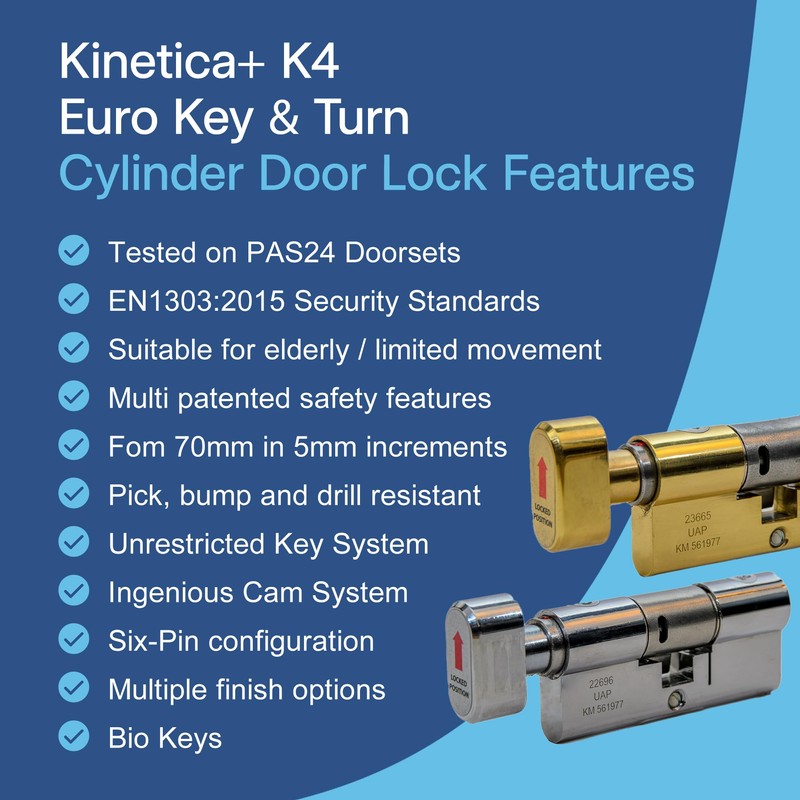 - ENHANCED SECURITY - KINETICA K4 3* Kitemarked Key & Turn Euro Cylinder Door Locks are designed to provide unparalleled security and safety, having been tested on various PAS24 doorsets. Featuring a six-pin configuration as standard, they provide enhanced security while also being resistant to picking, bumping, and drilling. The unrestricted key section allows local key duplication without authorisation, adding convenience without compromising security.