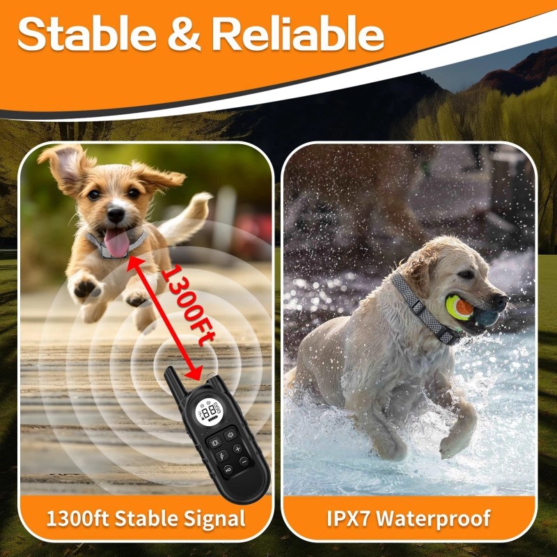 Whether rain or shine, our collar is built to last. With IPX7 waterproofing, it’s equipped to handle any weather condition. Plus, with a stable signal range of up to 1300ft, you won't have to worry about losing connection.