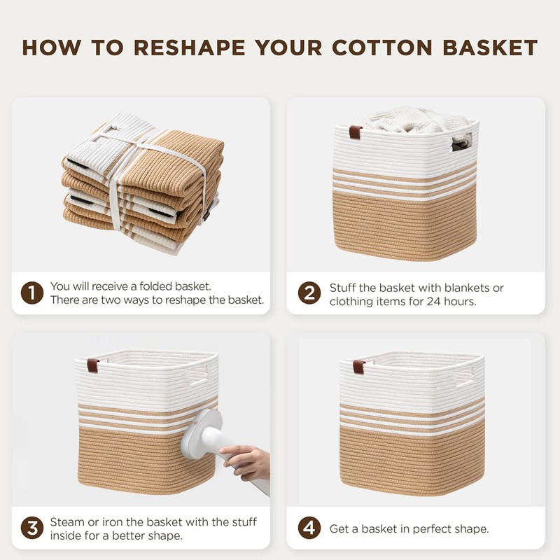 - **Extra Large & Durable Fabric** – Crafted from natural cotton rope, these 13-inch cube storage bins combine breathability with strength. The extra-large capacity effortlessly holds bulky items, making them perfect for closet bins, shelves, or living room storage.