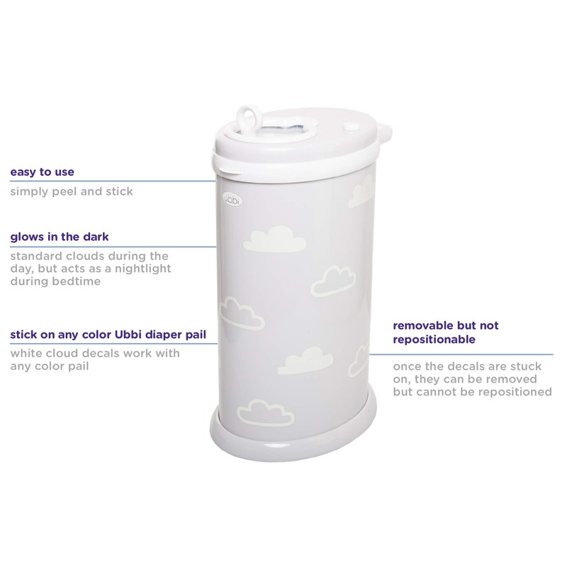 - Stick on any color Ubbi diaper pail: white cloud decals work with any color. Diaper pail sold separately