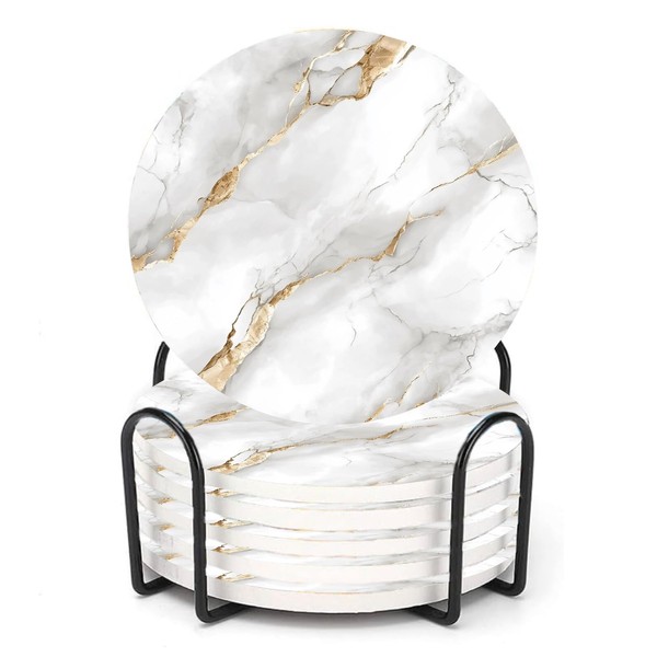 ubcindy White and Gold Crackle Vein Marble Coasters for Drinks Set of 6, Round Absorbent Ceramic Stone Coaster, with Metal Holder and Cork Base for Coffee Table Desk Home Decor Housewarming Gift