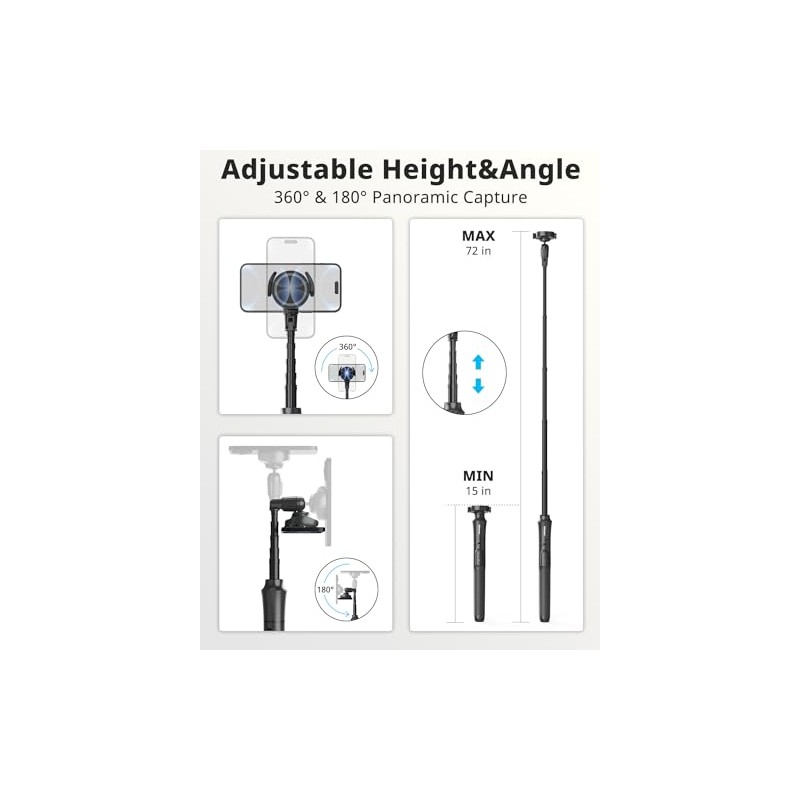 - Incredible Height up to 72 InchesThis phone tripod features a 6-section adjustable telescopic pole that can extend up to 72 inches in height. Folded down to just 15 inches, it easily fits into your bag so you can take it with you anywhere. Whether you're capturing selfies, vlogging, live streaming, or group photos, this selfie stick tripod offers versatile shooting heights for any occasion.