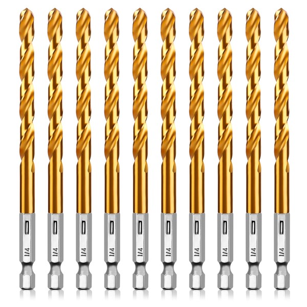 UBESTHS Titanium Twist Drill Bit Set, 10 Pcs 1/4" Hex Shank Drill Bits High Speed Steel for Wood, Plastic, Aluminum Alloy, Metal, Quick Change