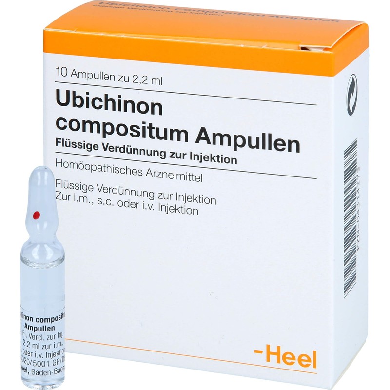 Ubichinon comp. ampoules PZN: 4314273 Contents: 10 pieces. The modern homeopathic remedy from Heel, a strong brand from nature. Active ingredients: Acidum ascorbicum, Conium maculatum, Hydrastis canadensis, Galium aparine, Acidum sarcolacticum, Hydroquinonum, Trichinoylum, Sulfur, Anthraquinonum, 1,4-Naphthoquinonum, Para-Benzoquinonum, Thiamini hydrochloridum, Disodium adenosinum triphosphoric. Coenzymum A, Acidum acetylosalicylicum, Histaminum, Nadidum, Magnesium gluconicum dihydricum, Acidum alpha-liponicum aquosum, Manganum phosphoricum aquosum, Sodium diethyloxalaceticum aquosum, Ubidecarenonum, Riboflavinum phosphoricum sodium, Pyridoxinum hydrohydro chloridum, chloridum, chlorInamidum, Vaccinium myrtillus, Colchicum autumnale, Podophyllum peltatum Information about the manufacturer: Biologische Heilmittel Heel GmbH Dr. Reckeweg-Straße 2-4 76532 Baden-Baden This item is . For risks and side effects, read the package leaflet and consult your doctor or pharmacist.