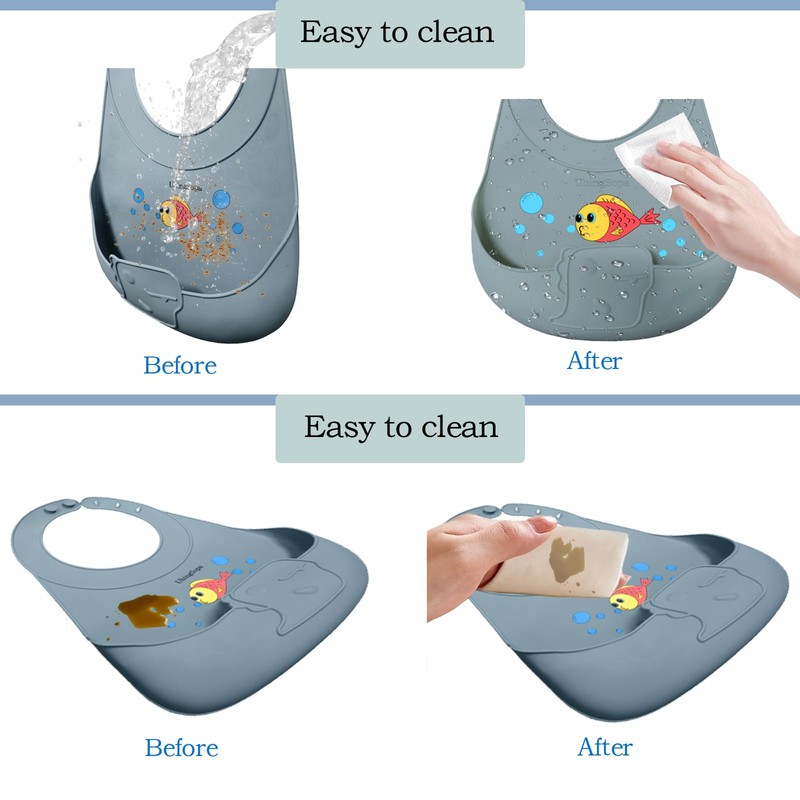 • [STABILIZED POCKETS]- Our silicone bibs come with deep stabilized spill pockets, the silicone pockets stay open to catch any loose food or liquids, preventing food scraps from falling out and allowing for easy collection and cleaning