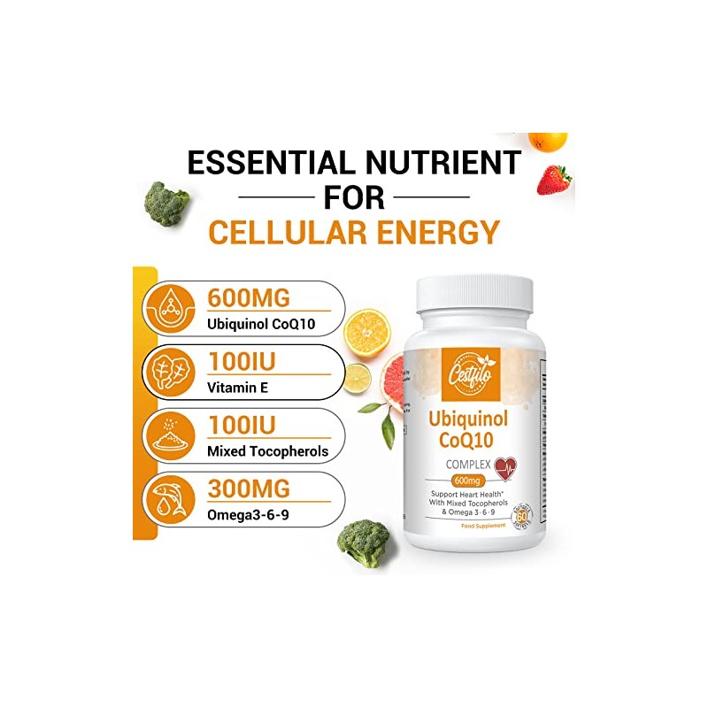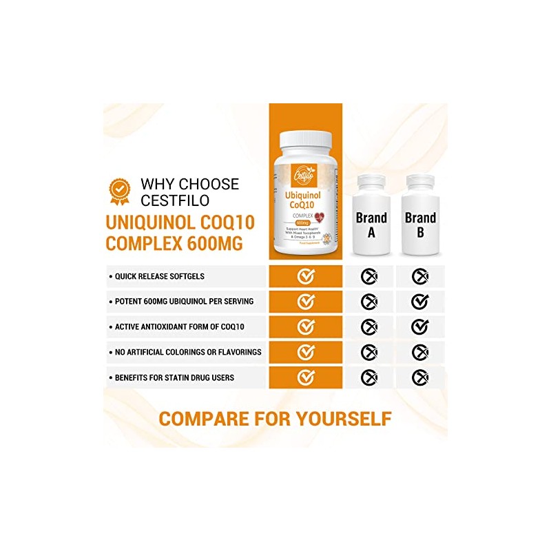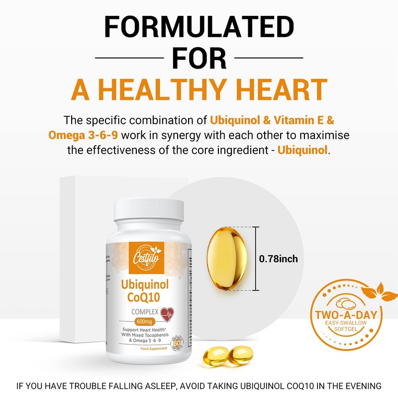 • MAXIMUM POTENCY - Cestfilo Ubiquinol come in the form of soft-gel capsules since production in the form of hard-shelled capsules seems to decrease the absorption rate and bioavailability of the product. Our patented Ubiquinol has a good ratio between water-solubility and fat-solubility, unlike regular CoQ10 that does not dissolve in water and dissolves very poorly in fat. Each bottle comes with 60 mini softgels of 600mg Ubiquinol Q10 for a one month supply.