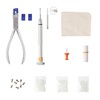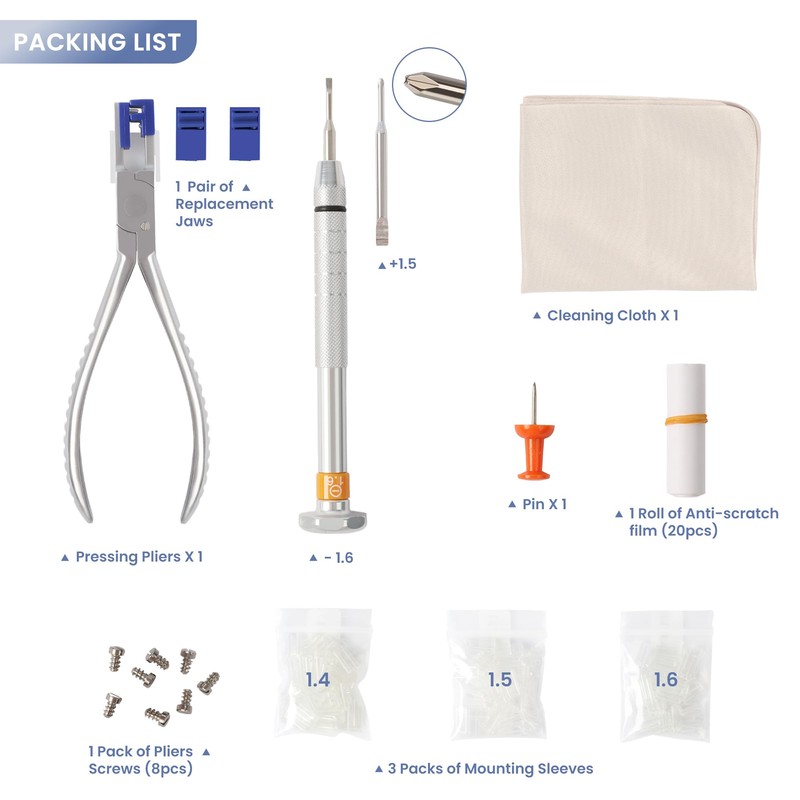 This essential tool set is perfect for repairing horizontal double-hole rimless glasses. It includes a stainless steel plier with interchangeable rubber jaws, and three common size mounting sleeves (1.4x0.8x7.0mm, 1.5x0.8x7.0mm, and 1.6x0.8x7.0mm) to fit most glasses. Additional accessories like a screwdriver enhance the DIY repair experience.