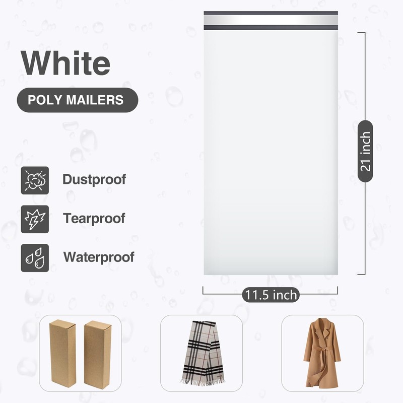 - Milky White Poly Mailers: The size of the bags is 11.5 x21 inches. These poly mailers are milky white, which differ from the normal white poly mailers. With gray inner lining, these poly mailers are opaque. Used tear resistant material, UCGOU poly mailers can not only protect your privacy well during transportation, but also keep your goods arriving safely