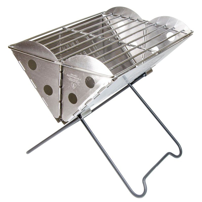 - Stainless steel grill folds to 1.5 inches thick and fits in a backpack; can be used as a fire pit; comes in regular or mini sizes (sold separately)