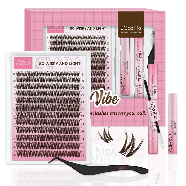 UCOOLME uCoolMe Brown Flora Lash Clusters Kit 8-16mm D Curl Individual Lashes Eyelash Clusters Kit DIY Eyelash Extension Kit with New Lash Bond and Seal,Remover 0.05mm Ultra-Thin Black Lash Band(Brown Flora)