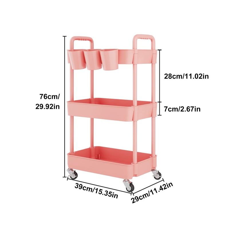 UDEAR 3-Tier Rolling Utility Cart,Multifunctional Storage Shelves with Handle and Lockable Wheels for Room,Office,Kitchen,Bathroom,with 3 Hanging Cups,Pink