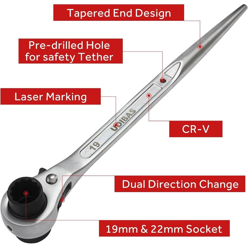 • High-quality ratcheting podger scaffold wrench with double-ended socket (19x22mm / 3/4" x 7/8"). Length: 12.5 inches, Weight: 1lb. Lifetime warranty