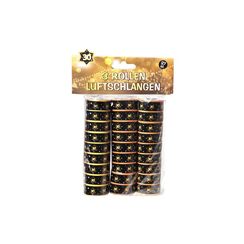 - Box contents: 3 rolls of 9 streamers each. Length of each snake: approx. 4 m - approx. 14 mm wide, material: paper, colour: black/gold, number: 30
