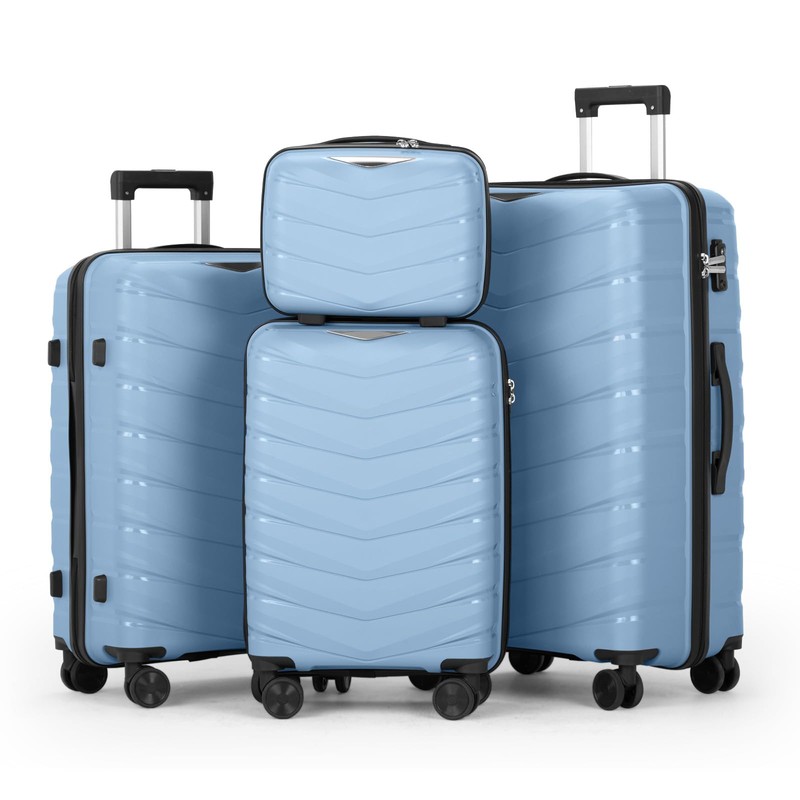 Udorich Elegant V-Stripes 4-Piece Travel Luggage Set for Effortless Journeys, Stylish Sky Blue Design, 14in-28in Trolley Cases Including Handbag