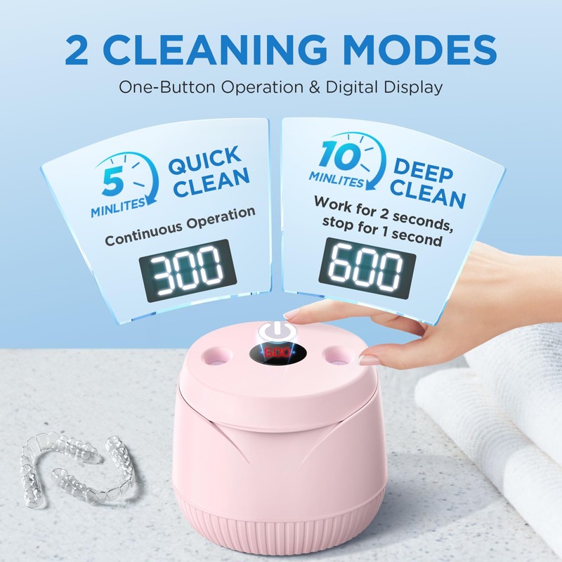 - DUAL CLEANING MODES: The ultrasonic retainer cleaner features dual cleaning modes that can be easily switched by pressing a button: I.Quick 5-minute clean with ultrasonic cleaning and UV light. II. Deep 10-minute clean with ultrasonic pulse cleaning and UV light. The 10-minute cleaning mode works for 2 seconds and pauses for 1 second to enhance the cavitation effect of ultrasonic cleaning and achieve more thorough cleaning effect.
