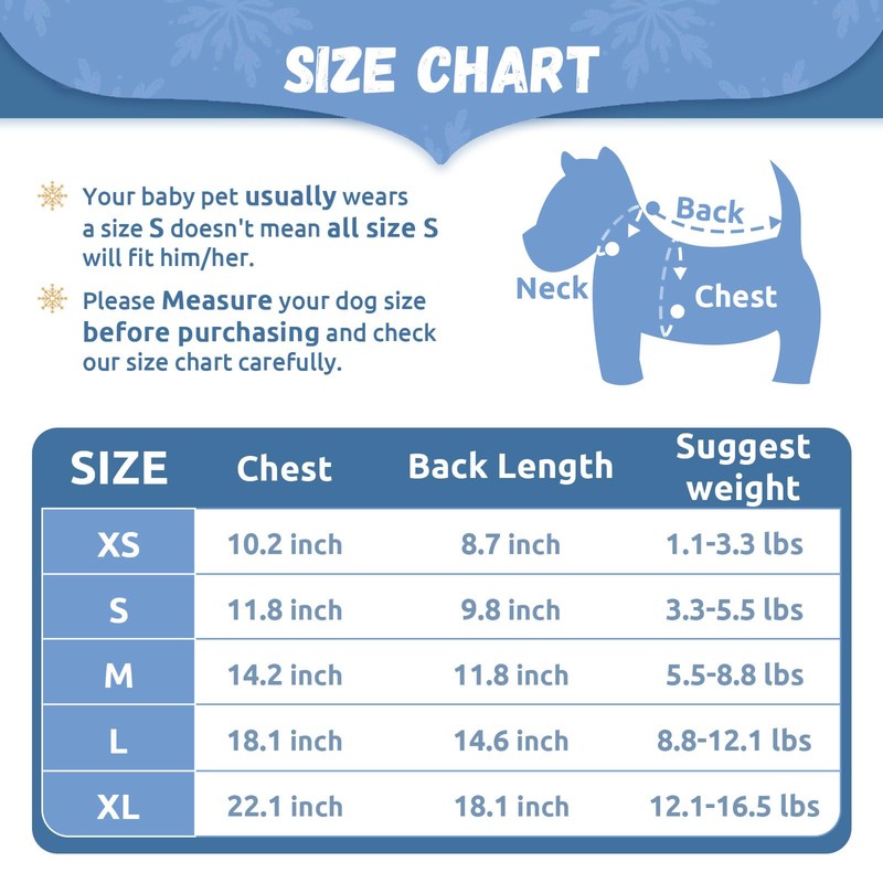 - Small Dog/Cat Sweaters - Please measure your pet’s chest and neck girth, then check our size chart. It it is between two sizes, please choose on size larger. Usually your pet wears size S, but it does not mean that all sizes S are suitable for him/her. This dog winter clothes is suitable for most cats, puppies, small dogs like Chihuahua, Pomeranian, Dachshund, Maltese, Shih Tzu, Pug, Yorkie, Shar Pei and so on