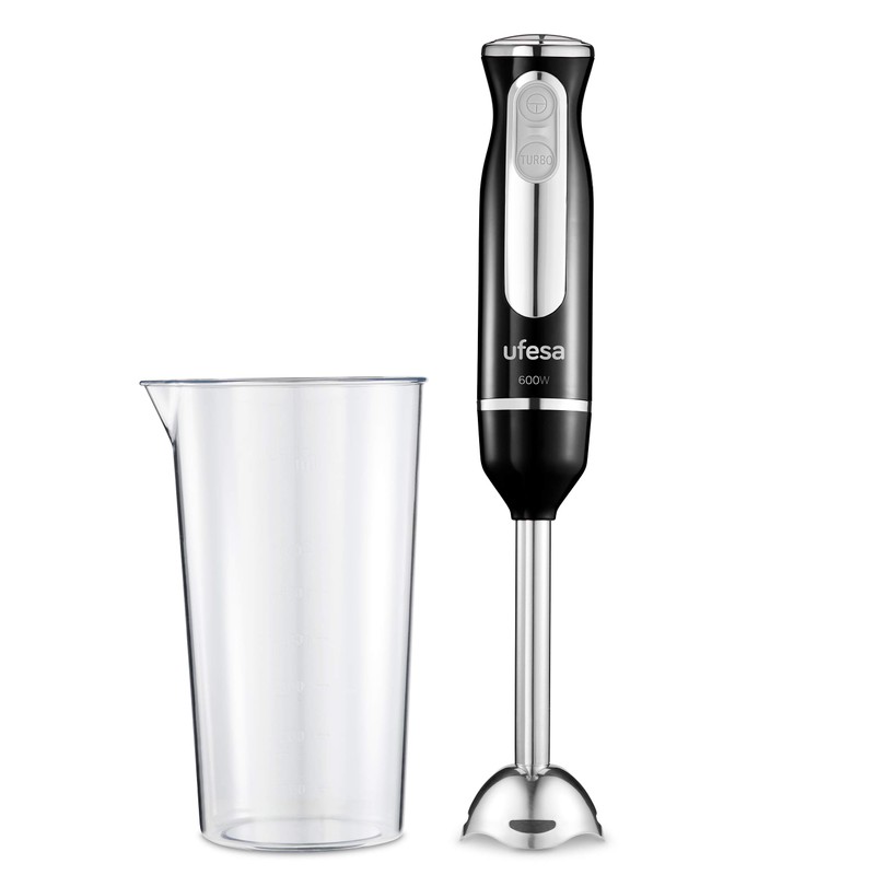 Ufesa BP3442 Hand Blender, 600 W, Turbo Function, 2 Stainless Steel Blades and Base, Ergonomic and Splash-proof Design, Includes Measuring Cup, BPA-Free, Black