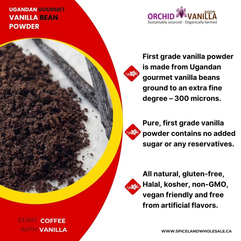 Experience the bold flavor of our Ugandan Ground Vanilla Bean Powder Gourmet First Grade, made from 100% pure ground Ugandan vanilla beans. This gourmet powder captures the rich, creamy essence of Ugandan vanilla, known for its deep flavor profile with earthy and woody notes. Free from added sugars or preservatives, it offers a natural alternative to traditional vanilla extracts, maintaining its potent flavor even at high cooking temperatures.