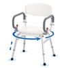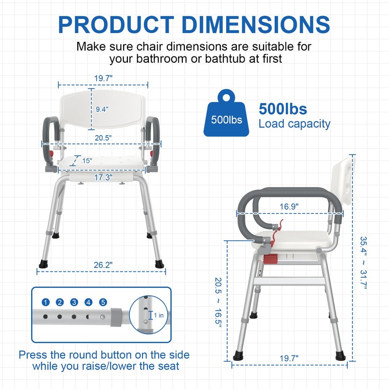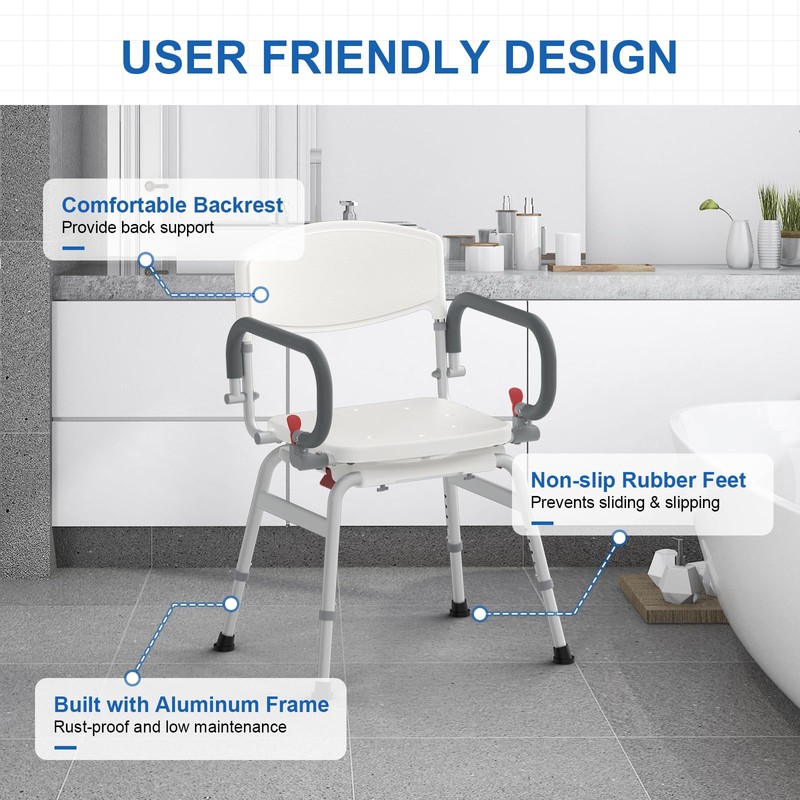 - 【Durable and Lightweight】Swivel shower chair with armrests and backrest crafted with premium rust-resistant aluminum alloy, supporting up to 500lbs for ultimate reliability. Engineered for users seeking safety and comfort, making it ideal for caregivers to reposition without strain. Corrosion-proof aluminum construction ensures years of maintenance-free service while retaining its sleek appearance, with reinforced joints and thickened tubing strategically placed for optimal weight distribution