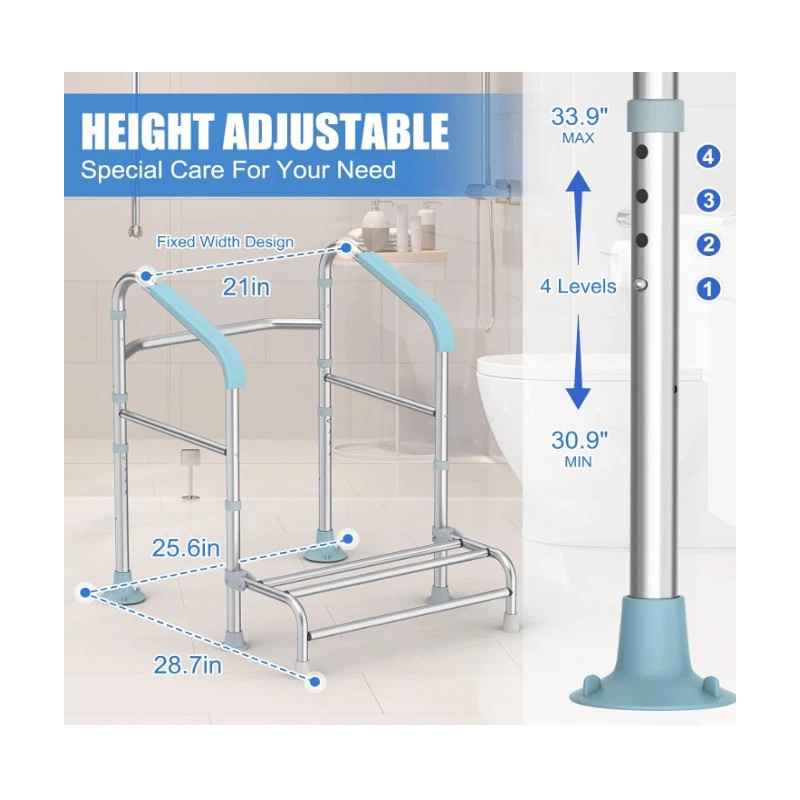 - ADJUSTABLE HEIGHT: This non-slip toilet assist rails has four height adjustments, and the easy-to-use adjustment design allows you to customize heights from 30.9" to 33.9" freely, making it suitable for people of most heights without requiring multiple frames. Our sturdy elderly toilet support rails has a fixed width 21 inches that between the two handles, making it perfect for most of toilets.